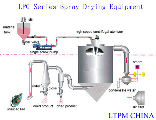 Udara melalui filter dan heater, penyalur udara yang masuk ke atas dedicator, udara panas berbentuk spiral dan masuk ke dedicator secara merata.Cairan bahan , dari wadah cairan bahan dari yang berselisih dengan masyarakat atau penyemprot pimpinan untuk bagian atas pompa yang dikirim melalui filter, membuat cairan bahan menyembur keluar menjadi penurunan kalori yang sangat kecil, cairan bahan dan aliran udara panas dan tetap berhubungan, uap air menguap dengan cepat, dalam waktu yang sangat singkat kering untuk menjadi produk jadi, pelepasan produk jadi oleh bagian bawah menara kering dan pemisah angin puyuh, gas buang dibuang oleh peniup udara.